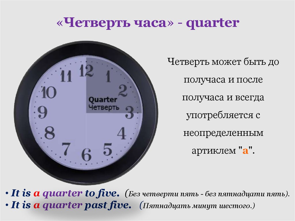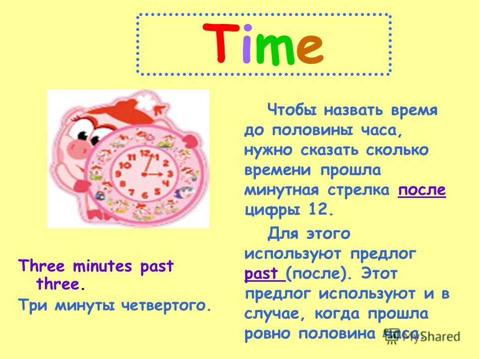 2) Наоборот. Сначала сколько минут, а потом часов. (Minutes + PAST / TO + Hour)