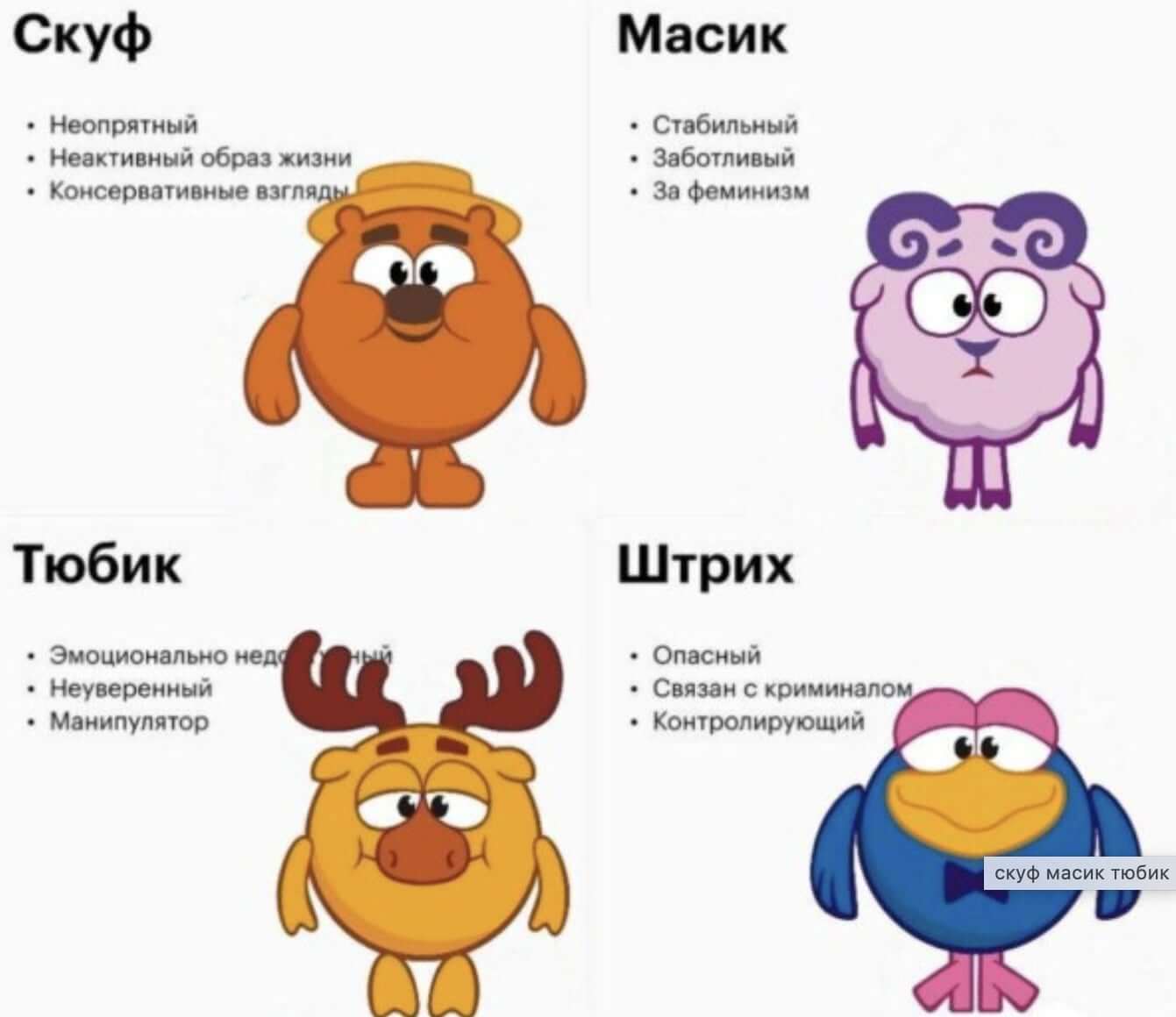 Первые мемы были вот такими – в сетку-шаблон с названием и тезисным описанием добавляли знакомых всем персонажей. Например, вот классификация на основе персонажей из «Смешариков»: