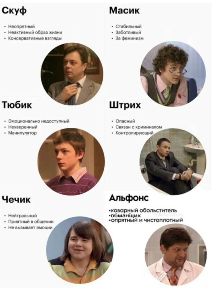 А вот классификация на основе персонажей из сериала «Папины дочки»: