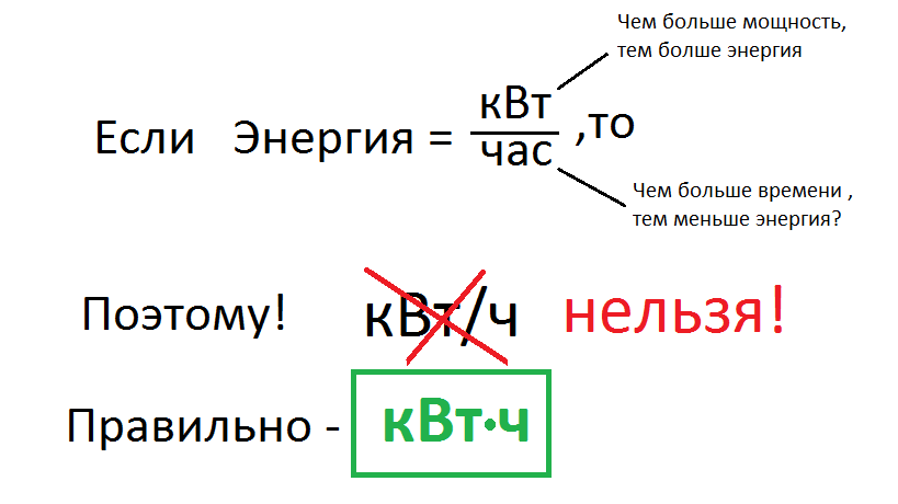 Определение ответа на вопрос дано на картинке запроса из Гугла, но я немного разверну его. Тут надо малость вспомнить математику и дроби. Если мы ошибочно сделаем запись о потребленной энергии в виде 100 кВт/ч, то это будет означать, что чем больше у нас киловатт мощности имеет нагрузка (чайник, утюг), то энергии потребляться будет больше (киловатты в числителе). А вот чем больше часов ваш чайник в N киловатт будет потреблять энергии, тем меньше энергии счетчик накрутит (часы находятся в знаменателе и уменьшают величину дроби). Но это же не так. – в очередной раз промелькнуло в голове читателя: чем больше времени включен чайник, тем больше киловатт-часов накручивает счетчик! Да, все верно, поэтому и записывается правильно единица измерения электроэнергии как кВт*ч, т.е. мощность, умноженная на время= электрическая энергия.