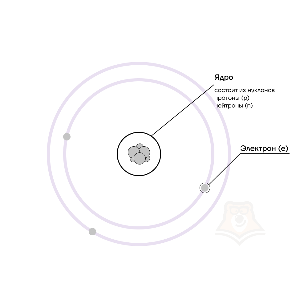 Долгое время считалось, что атом нельзя разделить далее на составляющие. Но с развитием науки ученые-физики выяснили, что атом состоит из более мелких, или элементарных частиц — протонов (p), нейтронов (n) и электронов (ē). В центре атома располагается ядро, которое состоит из протонов и нейтронов (их общее название нуклоны), а вокруг ядра вращаются электроны.
