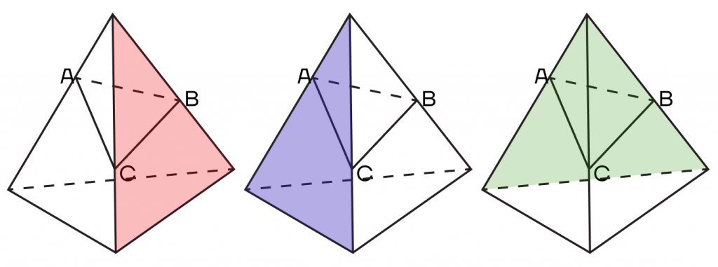 При этом пары вершин А и В, В и С, А и С лежат в одной грани и принадлежат одной плоскости.