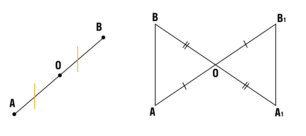 На картинках центральная симметрия: точка O здесь — центр симметрии