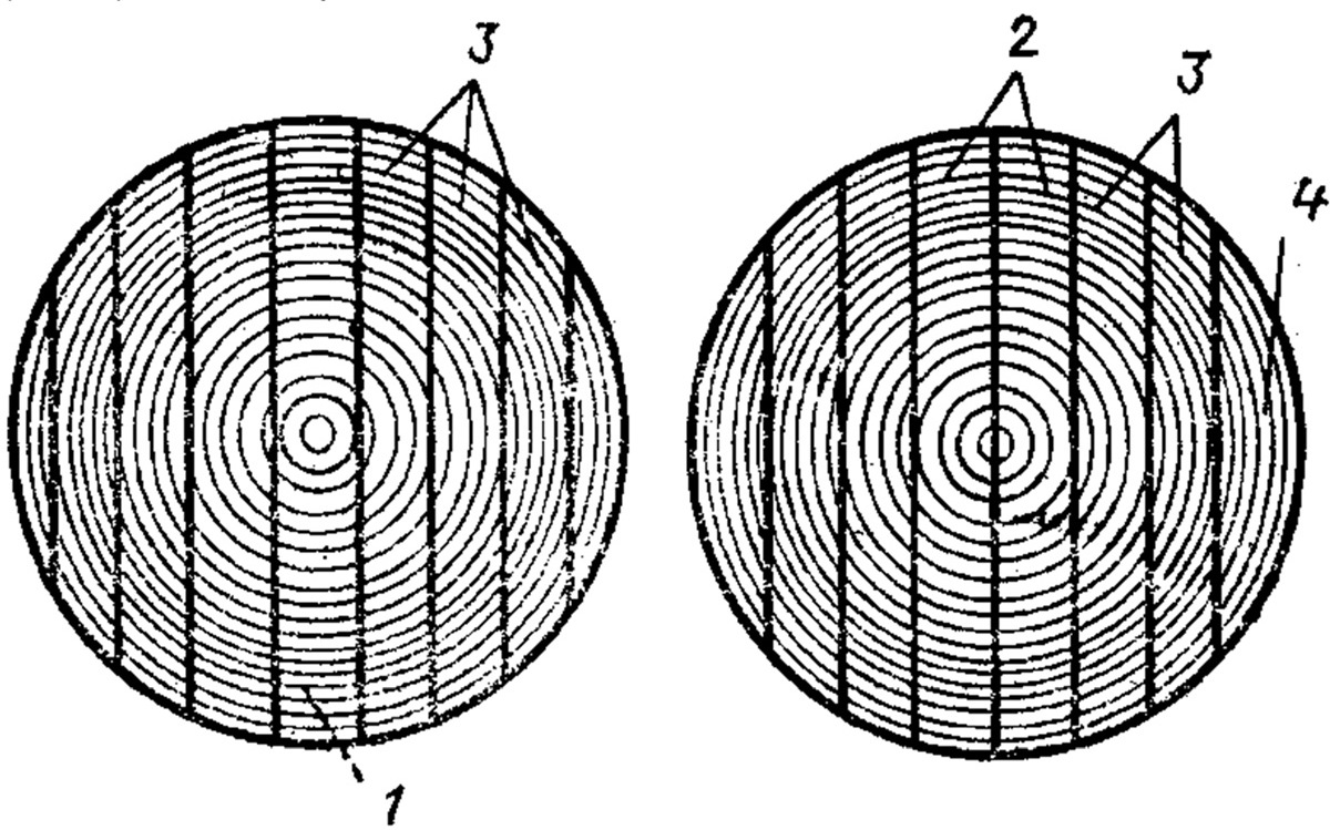 Рис. 10. Виды распиловки досок: 1 – сердцевинная доска; 2 – центральные доски; 3 – боковые доски; 4 – горбыли