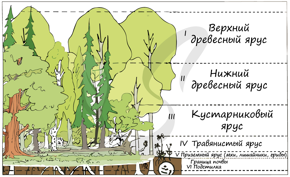 Многоярусность растительного сообщества служит приспособлением к равномерному распределению света: светолюбивые растения занимают верхний ярус, а теневыносливые растения отлично чувствуют себя в тени светолюбивых