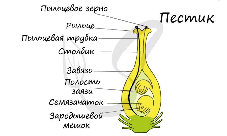 В отличие от голосеменных, у которых семязачатки лежат открыто на семенных чешуях, у цветковых семязачаток находится в замкнутом вместилище — завязи, сформированной из плодолистика (-ов).