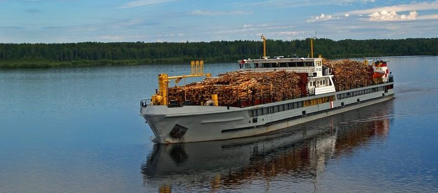 Сухогрузное речное судно перевозит лес