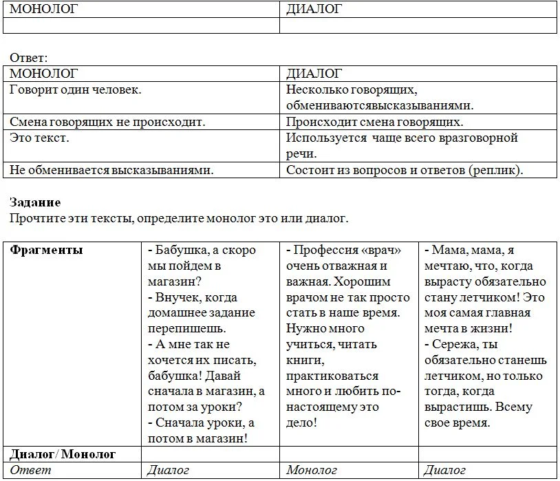 Ваша задача заполнить таблицу, написать, чем отличается монолог и диалог.