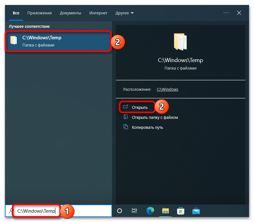 Кликните по значку поиска на панели задач или воспользуйтесь клавишами «Win+S», вставьте интересующий вас адрес папки «Temp». Кликните по нему в результатах выдачи для открытия.