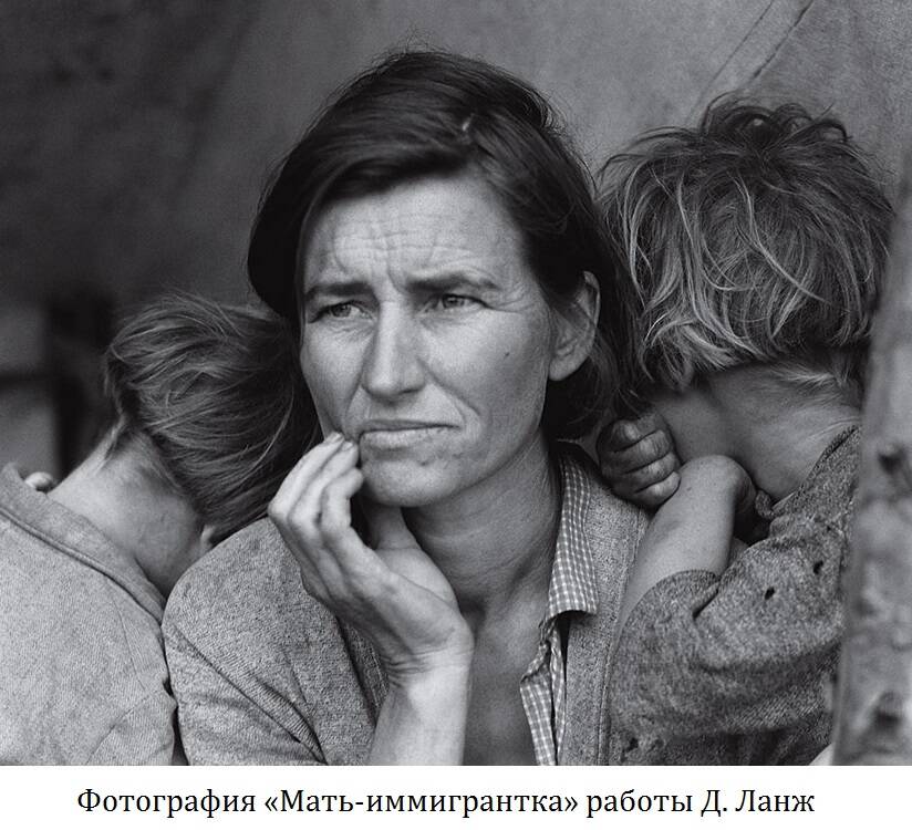 Фоторабота Доротеи Ланж «Мать-иммигрантка», сделанная ей в 1936 году, облетела весь мир и стала одним из наиболее известных символов Великой депрессии.