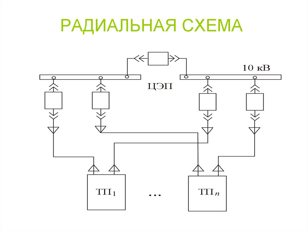 При радиальной схеме электроснабжения каждая линия является как бы лучом, соединяющим узел сети (подстанцию, распределительный пункт) с единственным потребителем.