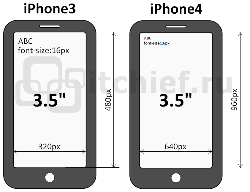 Первое устройство — это смартфон Apple iPhone 3 (диагональ 3.5″). Данный телефон не имеет высокую плотность пикселей. У данной модели она составляет 163ppi (меньше 200ppi). Физическое разрешение данного смартфона составляет 320×480. Такое разрешение соответствует диагонали, если его сопоставить с разрешением мониторов настольных устройств (компьютеров). Т.е. на веб-странице этого смартфона, текст, выполненный размером 16px, будет также хорошо читаемым как на мониторе компьютера.