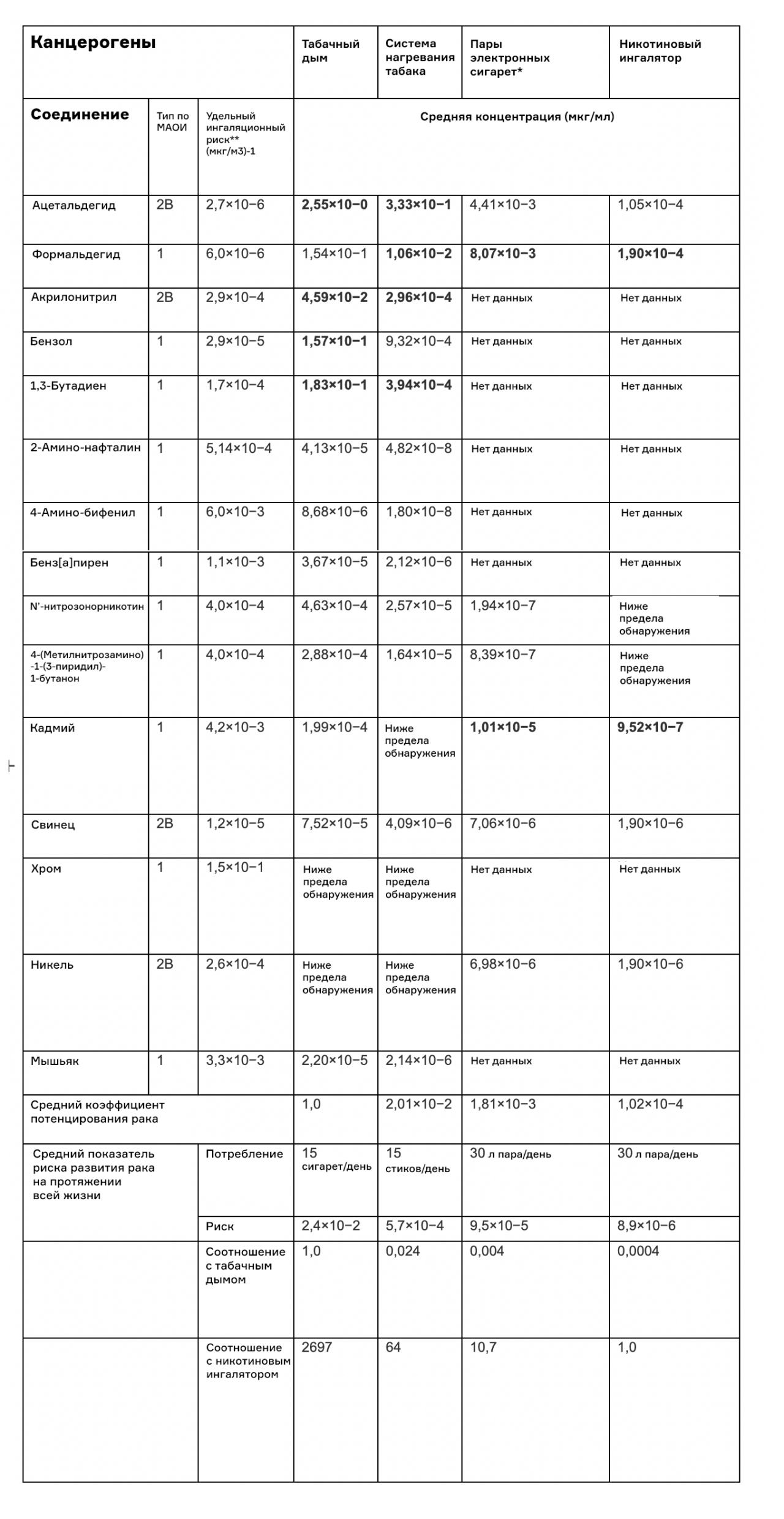 Таблица 1. Риски и средние концентрации для канцерогенов 1-го и 2-го типа по классификации Международной ассоциации изучения рака. Stephens, W. E. Tobacco Control. 2018; 27:10-17