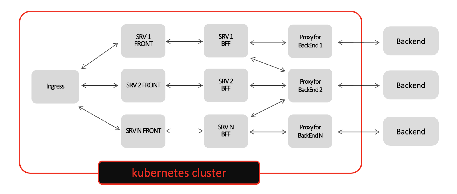 Внутри сервисного кластера работают микросервисы, выдающие тематический фронт и реализующие API.