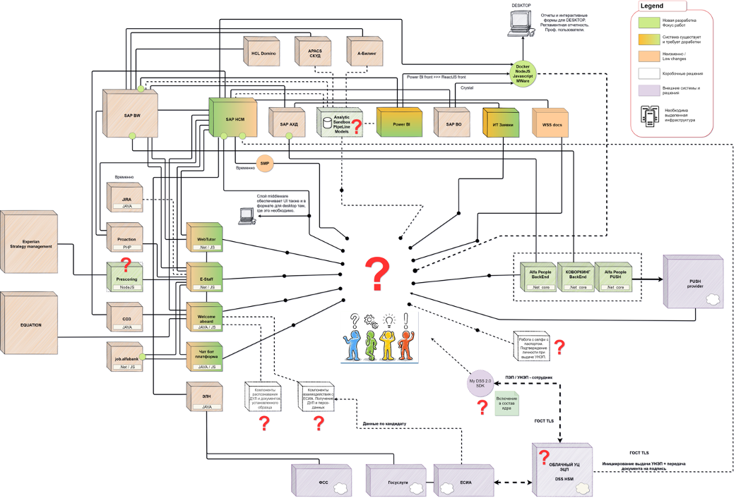 Множество backend-систем: SAP HCM, Lotus Notes, SAP АХД, E-Staff, WebSoft HCM, SharePoint и др.
