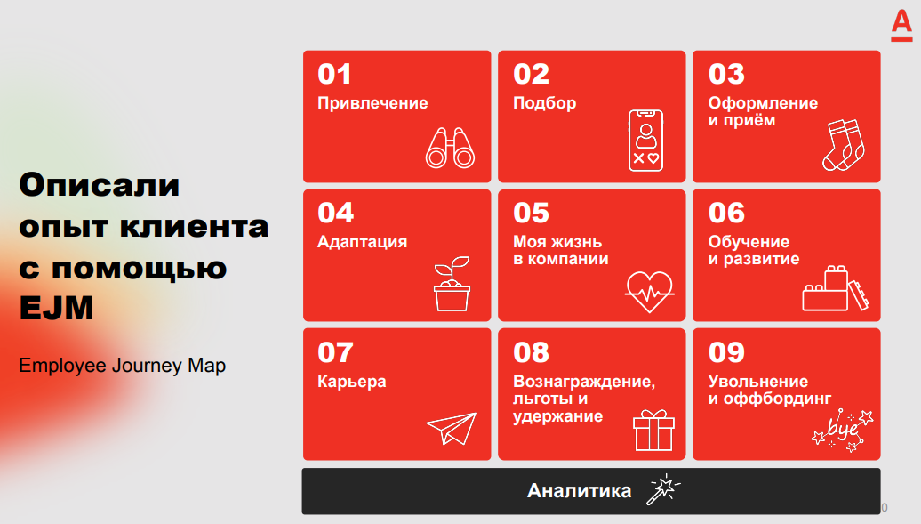 Девять основных блоков в Employee Journey Map Альфа-Банка
