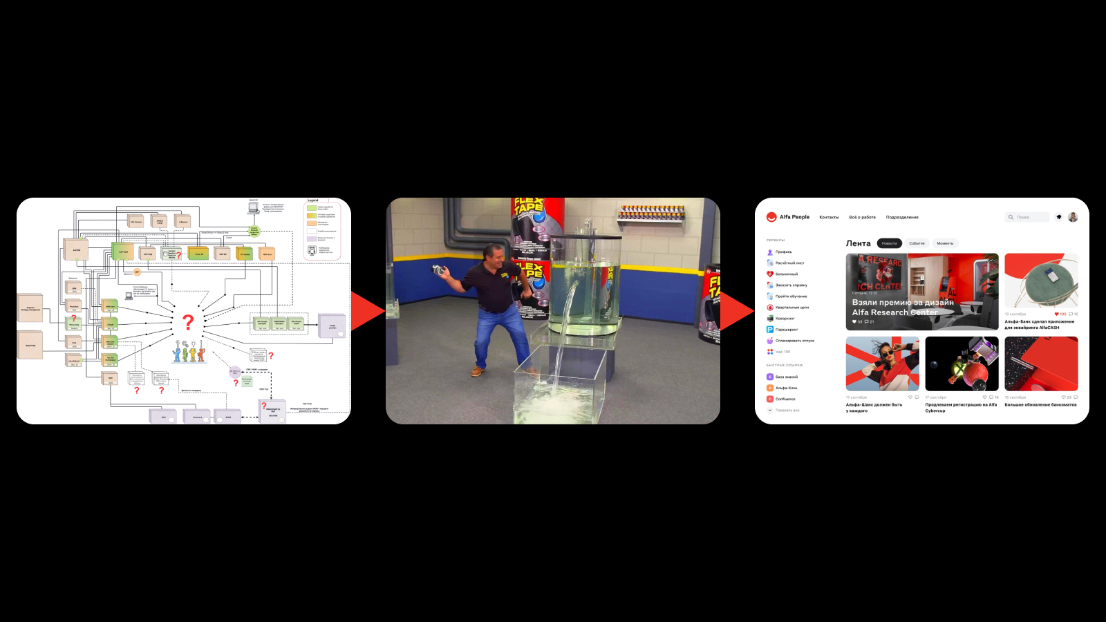 Когда мы увидели все эти процессы, в голове сразу появилась аналогия с нашим мобильным приложением для клиентов Альфы: у клиента одно приложение, в котором он может получить все банковские услуги. И подумали — почему для сотрудников должно быть по другому? Не должно быть — сделаем так же.