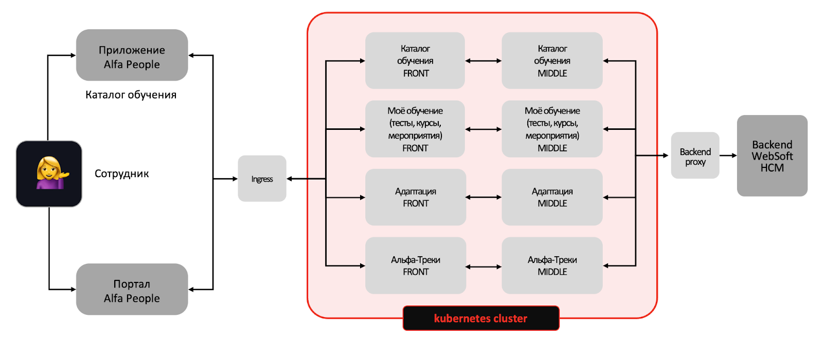 А архитектурно это все тот же знакомый подход. Сотрудник через удобный ему способ входит в Alfa People и выбирает нужный ему раздел в академии, а дальше дело за сервисным кластером.