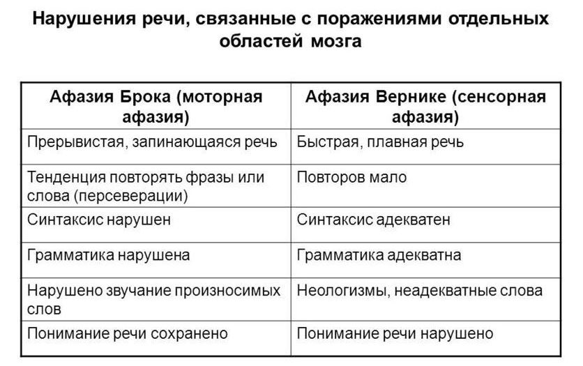 При поражении этой коры, либо при разрушении белого вещества (проводящих путей), происходит комплекс расстройств речи при моторной афазии. Моторная афазия после инсульта может быть различной, и встречается несколько ее видов.