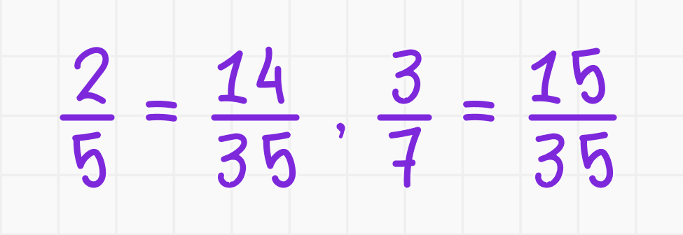 - Сравниваем числители: 14 и 15. Следовательно, 3/7 больше, чем 2/5.