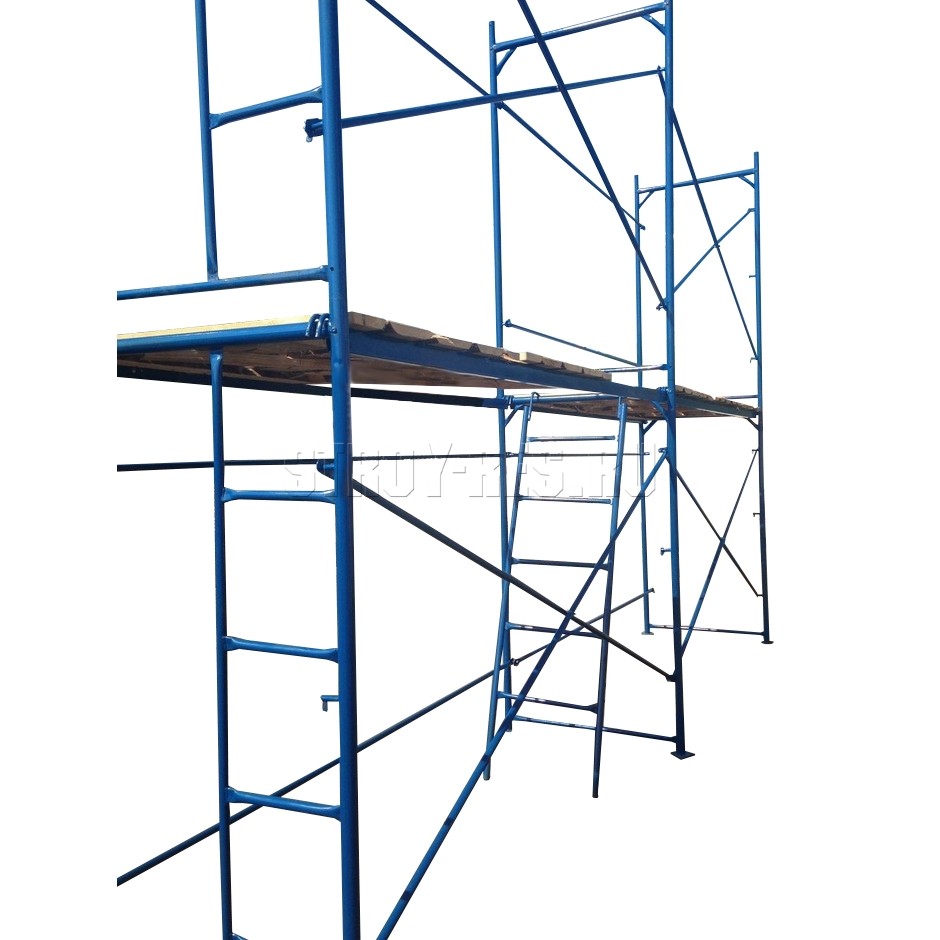 Рамные строительные леса собираются из трубчатых рам, которые соединяются между собой с помощью фиксирующих флажковых замков, горизонтальных и диагональных связей. Переход рабочих с одного яруса на другой обеспечивают лестницы, горизонтальное перемещение – рабочие настилы. Такие конструкции устанавливаются на нерегулируемые опоры с «пятками» или на регулируемые опоры. Второй вариант – более предпочтительный, поскольку позволяет надежно устанавливать оборудование на неровных поверхностях.