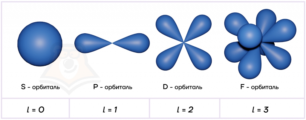 Орбитальное квантовое число (l), или его еще называют побочным квантовым числом, определяет форму атомных орбиталей (траекторий движения электрона).