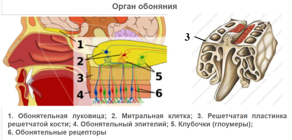 У человека в носу два органа обоняния: основной – сосредоточенный преимущественно в верхней носовой раковине, содержащей сенсорные обонятельные клетки для различения запахов, дополнительный – якобсонов (вомероназальный) орган, представляющий волосяную капсулу на стыке хрящевой части перегородки носа и сошника для различения феромонов. Наличие двух органов обоняния объясняется эволюционным развитием. В филогенетическом древе млекопитающих, насчитывающим сотни миллионов лет, были периоды, когда их предки на ранней стадии развития жили в двух средах: водной и на суше, соответственно, для каждой из сред нужен был свой орган обоняния.