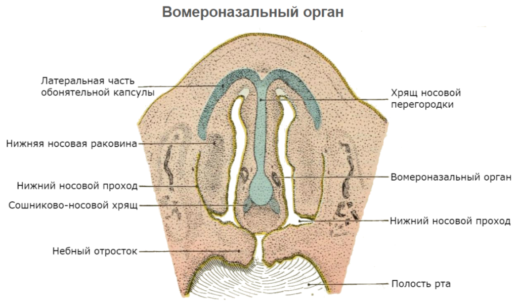 Вомероназальный орган – формируется в период эмбрионального развития. У взрослых людей выражен слабо и представлен вомероназальной ямкой (небольшим углублением) и не заключён, как у животных в оболочку, отделяющуюся от обонятельных рецепторов. Трубка вомера у человека составляет в длину 2 – 10 мм, диаметром 2 мм. Выход трубки, начинающейся практически на стыке хрящевой части перегородки и сошника.