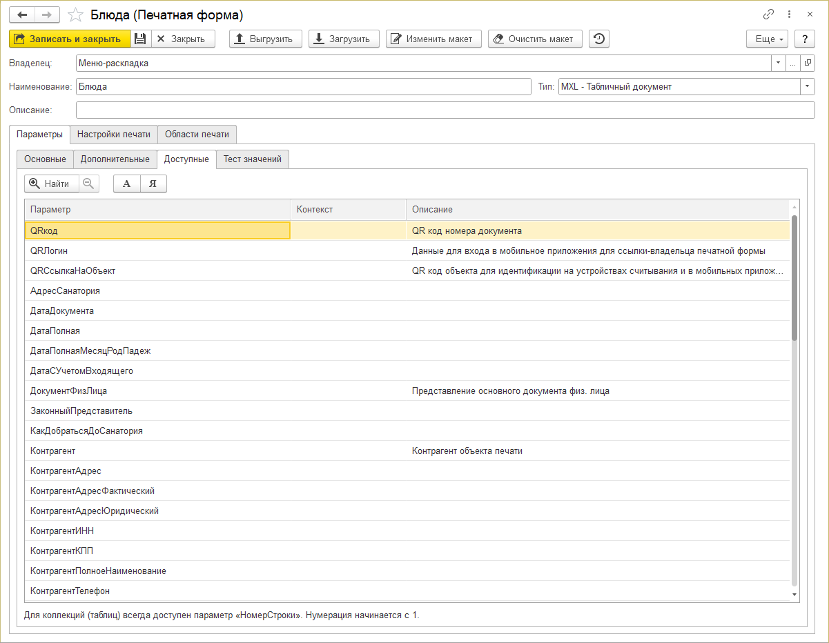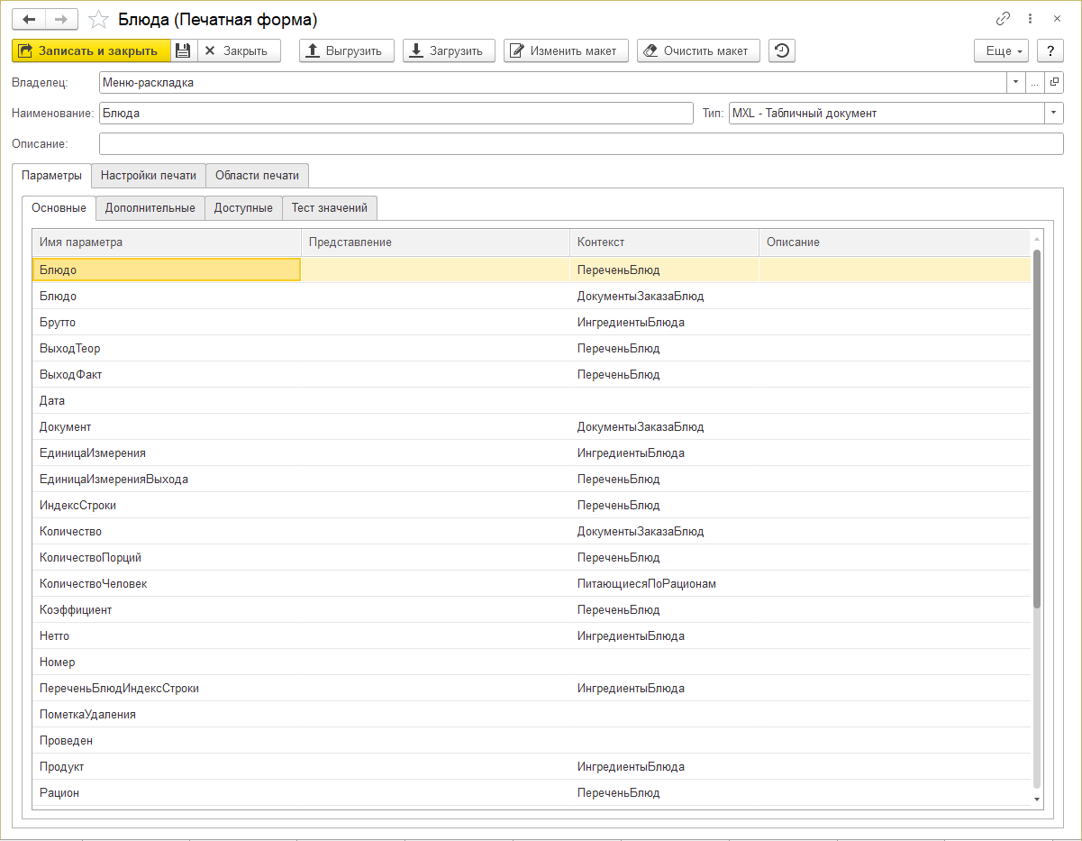 Также во внешней печатной форме может присутствовать макет с названием «Параметры_Авторегистрации» в первой колонке которого можно перечислить объекты метаданных, к которым принадлежит печатная форма. Используется этот макет для автоматического заполнения принадлежности печатной формы.