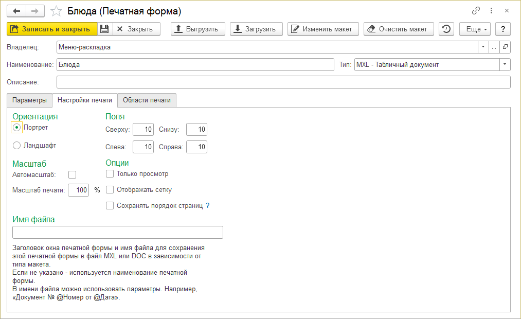 - Добавляем новый элемент справочника и указываем файл печатной формы;