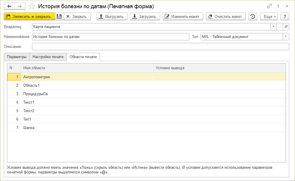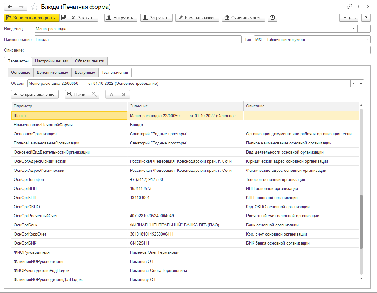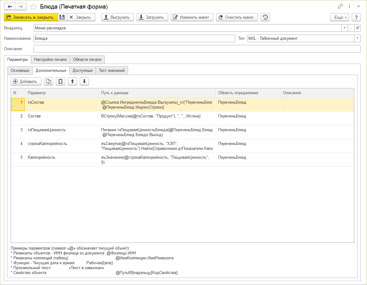 ТабДок = Новый ТабличныйДокумент; Макет = ЭтотОбъект.ПолучитьМакет(«Макет»); ОбластьСтрока.Параметры.Документ = СсылкаНаОбъект; //обращение к дополнительным параметрам рекомендуется снабдить Возврат ТабДок; КонецФункции |