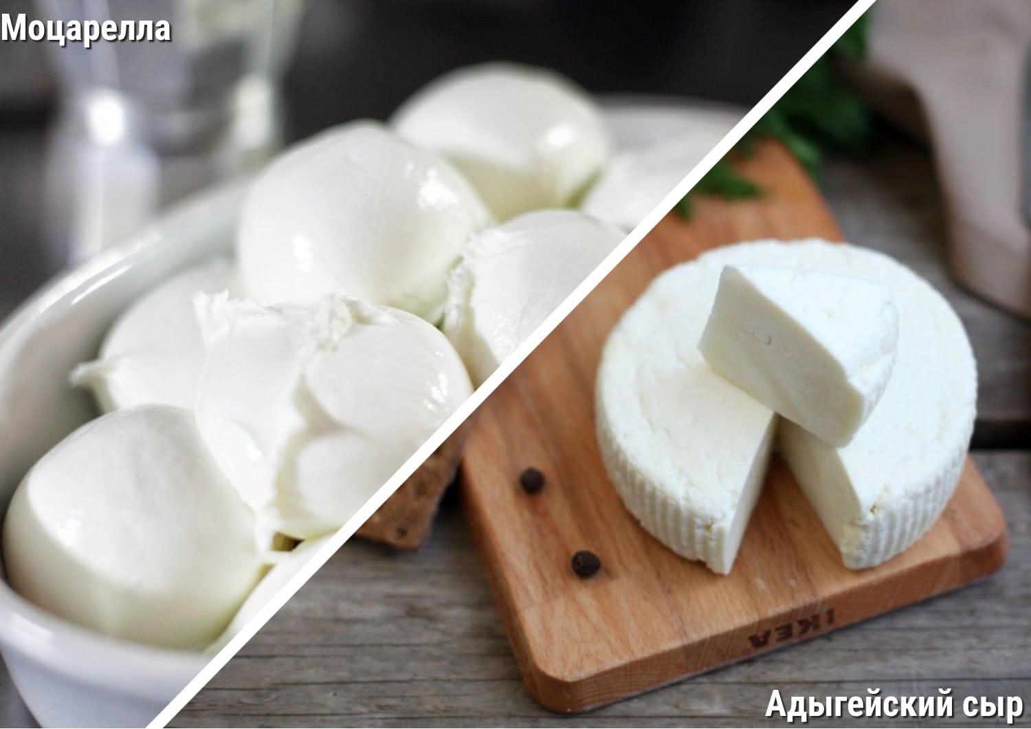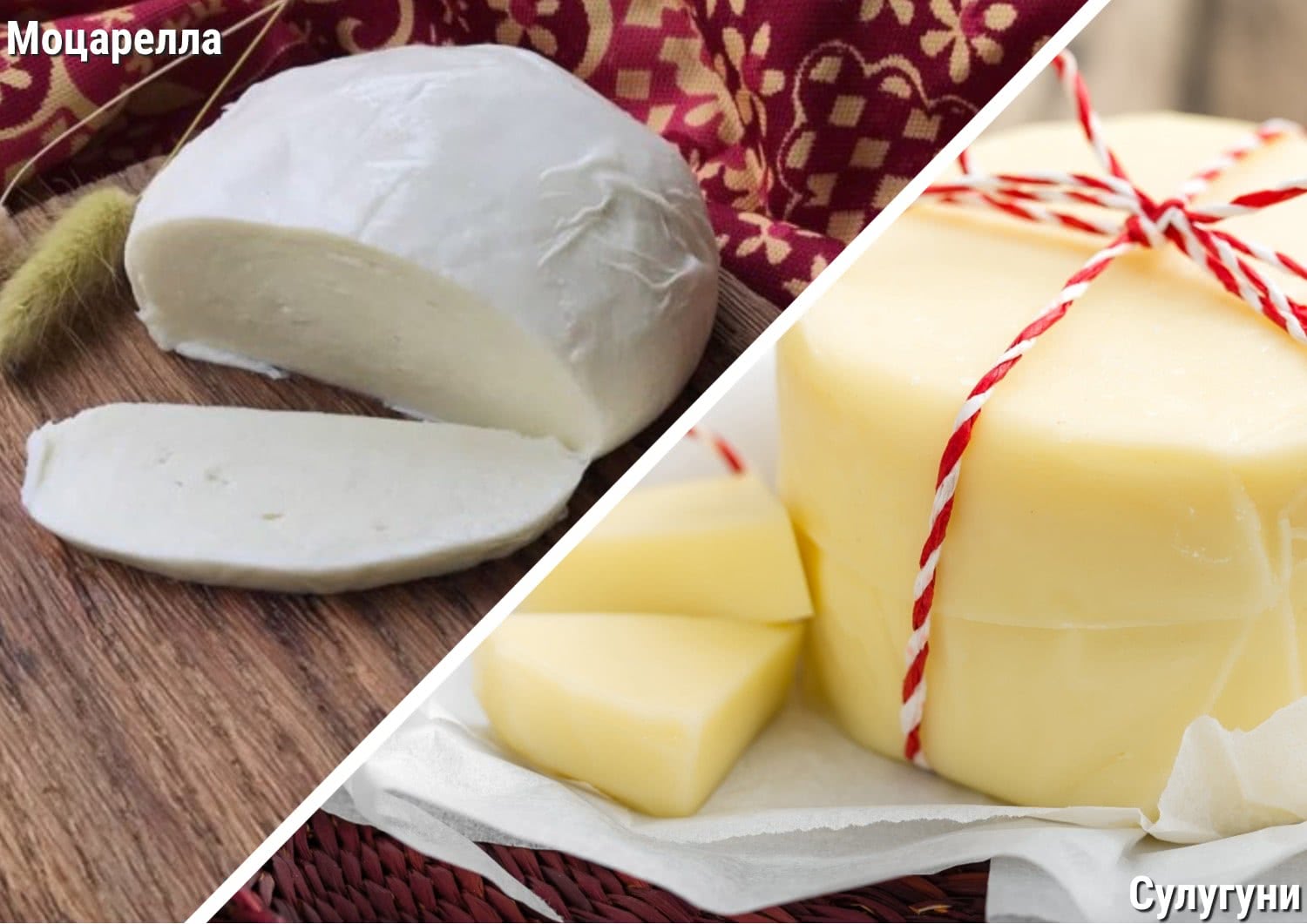 Сыр Скаморца (вверху) и моцарелла для пиццы (внизу)