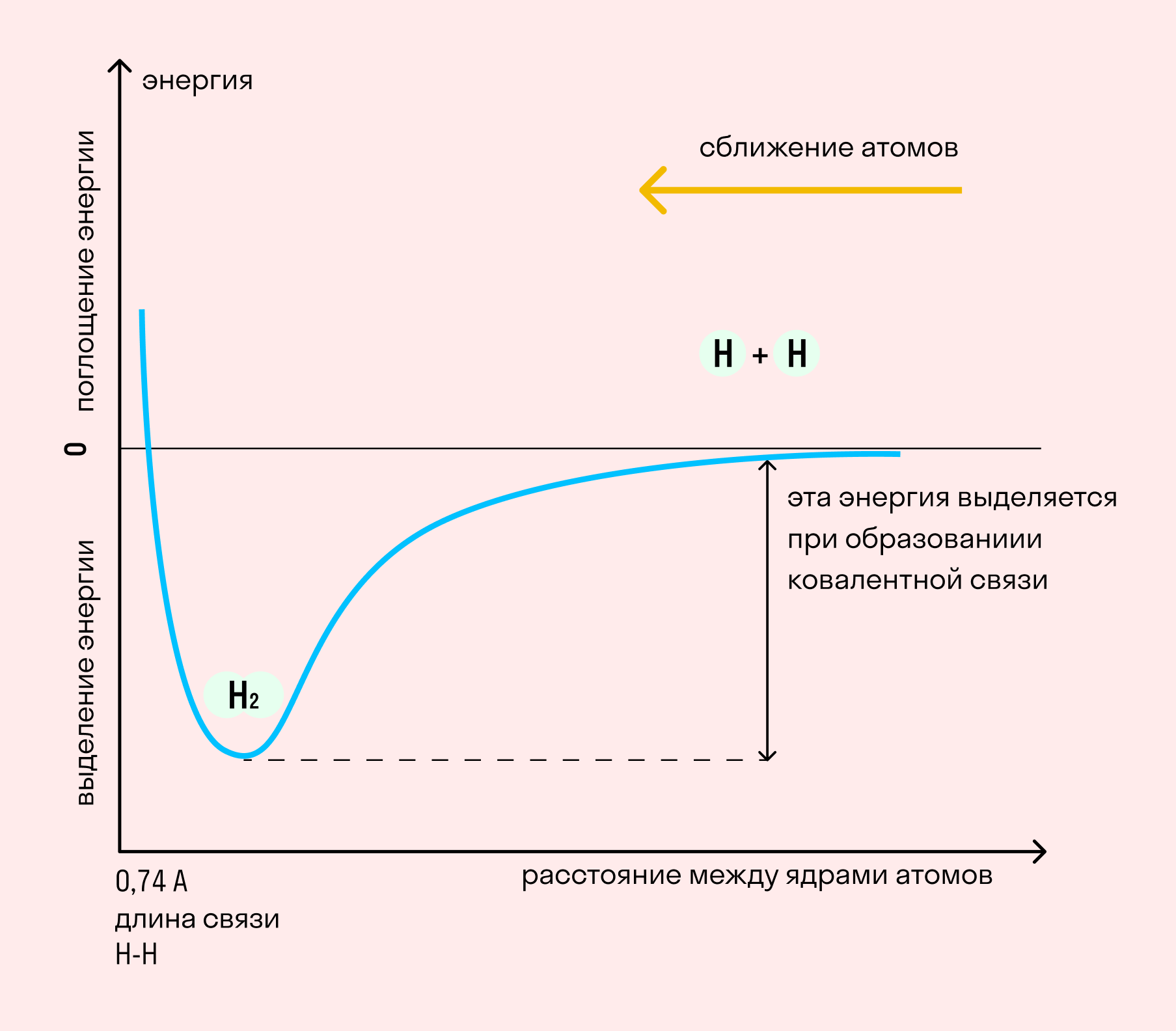 Ðа пÑимеÑе ÑимиÑеÑкой ÑвÑзи в молекÑле водоÑода поÑмоÑÑим, как менÑеÑÑÑ ÑнеÑÐ³Ð¸Ñ ÑиÑÑÐµÐ¼Ñ Ð¿Ñи ÑокÑаÑении ÑаÑÑÑоÑÐ½Ð¸Ñ Ð¼ÐµÐ¶Ð´Ñ ÑдÑами аÑомов. Ðо меÑе ÑÐ±Ð»Ð¸Ð¶ÐµÐ½Ð¸Ñ ÑÐ´ÐµÑ ÑлекÑÑоннÑе оÑбиÑали ÑÑÐ¸Ñ Ð°Ñомов наÑинаÑÑ Ð¿ÐµÑекÑÑваÑÑ Ð´ÑÑг дÑÑга, в иÑоге поÑвлÑеÑÑÑ Ð¾Ð±ÑÐ°Ñ Ð¼Ð¾Ð»ÐµÐºÑлÑÑÐ½Ð°Ñ Ð¾ÑбиÑалÑ. ÐеÑпаÑеннÑе ÑлекÑÑÐ¾Ð½Ñ ÑеÑез облаÑÑи пеÑекÑÑÐ²Ð°Ð½Ð¸Ñ ÑмеÑаÑÑÑÑ Ð¾Ñ Ð¾Ð´Ð½Ð¾Ð³Ð¾ аÑома в ÑÑоÑÐ¾Ð½Ñ Ð´ÑÑгого, возникаÑÑ Ð¾Ð±Ñие ÑлекÑÑоннÑе паÑÑ. ÐÑе ÑÑо ÑопÑовождаеÑÑÑ Ð½Ð°ÑаÑÑаÑÑим вÑделением ÑнеÑгии. Сближение пÑоиÑÑÐ¾Ð´Ð¸Ñ Ð´Ð¾ ÑÐµÑ Ð¿Ð¾Ñ, пока ÑÐ¸Ð»Ñ Ð¿ÑиÑÑÐ¶ÐµÐ½Ð¸Ñ Ð½Ðµ компенÑиÑÑÐµÑ Ñила оÑÑÐ°Ð»ÐºÐ¸Ð²Ð°Ð½Ð¸Ñ Ð¾Ð´Ð½Ð¾Ð¸Ð¼ÐµÐ½Ð½ÑÑ Ð·Ð°ÑÑдов.