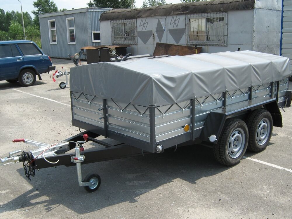 Если предпочесть двухосную модель, можно будет приобрести конструкцию с перекрытием. Такого типа легковые прицепы способны выдержать нагрузку 350–700 кг на каждое из четырёх колёс, максимально разрешённый вес зависит только от типа установленных колёс. Двухосный прицеп лучше ещё и в том случае, если требуется перевезти очень крупные грузы, у которых высокий центр тяжести, — четыре колеса обеспечат хорошую устойчивость.