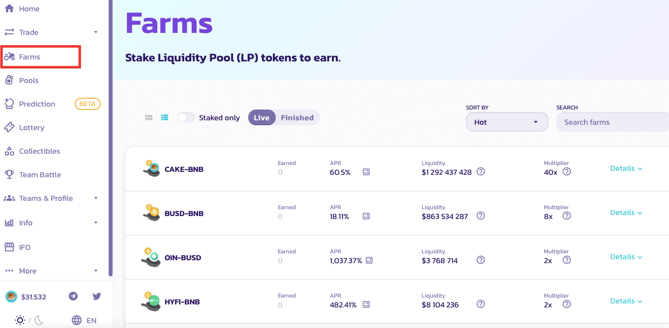 Раздел биржи «Farms» позволяет зарабатывать пользователям на фарминге монет. Для этого используются специальные токены LP, которые участники получают за предоставление средств в пул ликвидности.