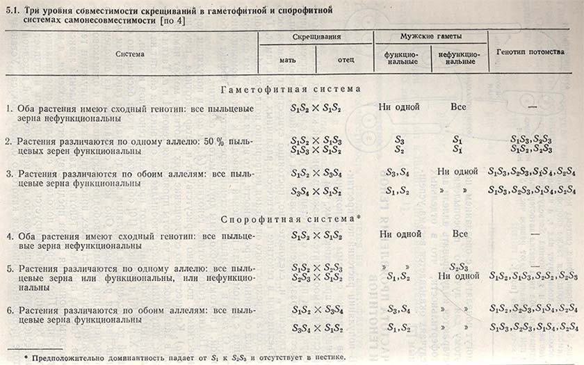 Спорофитная несовместимость. Эта система несовместимости также обусловлена рядом аллелей в одном локусе, по в отличие от гаметофитной системы в данном случае функциональность пыльцевых зерен определяется генетической конституцией растения, которое их продуцировало (см. табл. 5.1).