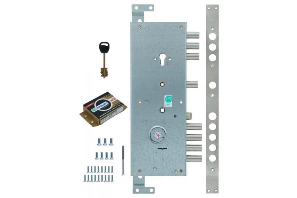 Стандартный комплект включает один замок с многоточечным механизмом. Замки данного типа, кроме основной точки запирания (место поворота ключа), приводит в действие расположенные по периметру мощные ригели из высокопрочной стали. Эти элементы защищают дверь от взлома и обеспечивают плотное прилегание створки к раме. Опционально можно оснастить дверь дополнительным коротким замком (с одной точкой запирания).