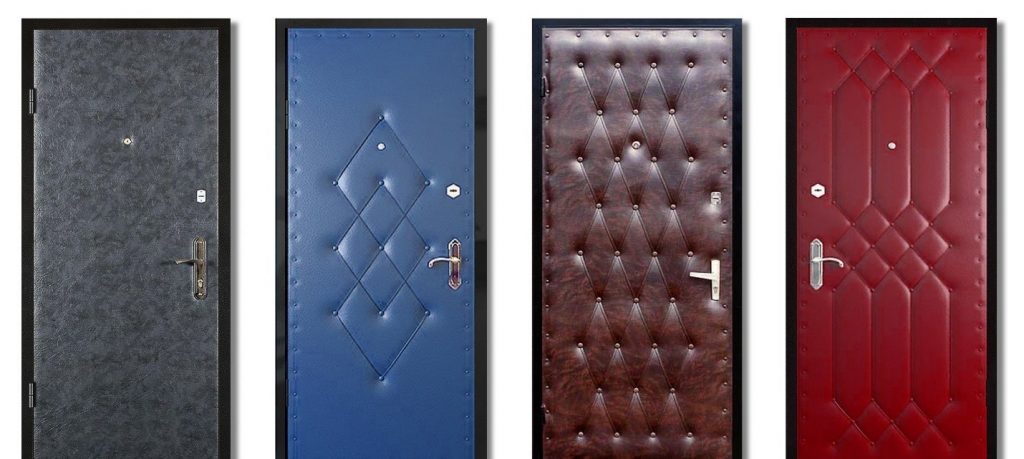 Обивка кожзаменителем. Такой вариант отделки известен многим потребителям ещё с советских времён – на металлическое полотно наклеивается ватин, который закрывается кожзаменителем. После фиксации материала, его поверхность стягивается с помощью гвоздей и проволоки.