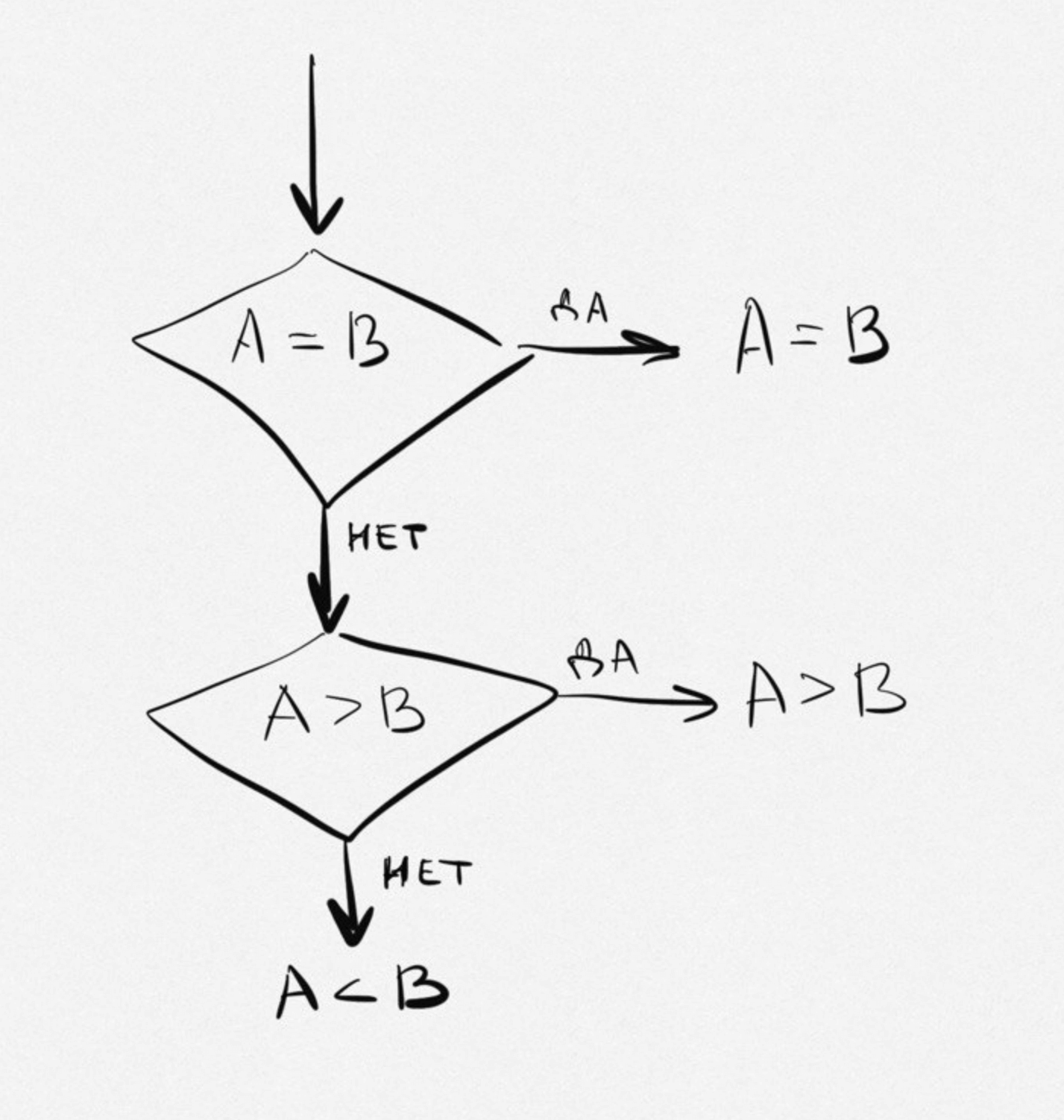 - сначала определит, равны ли числа A и B;