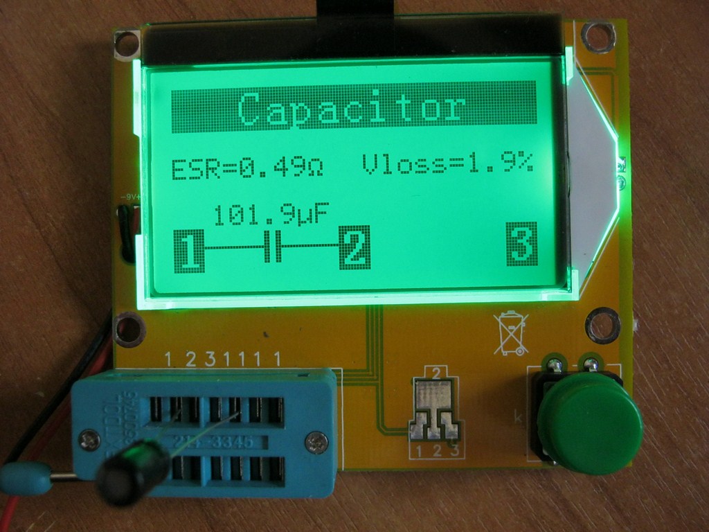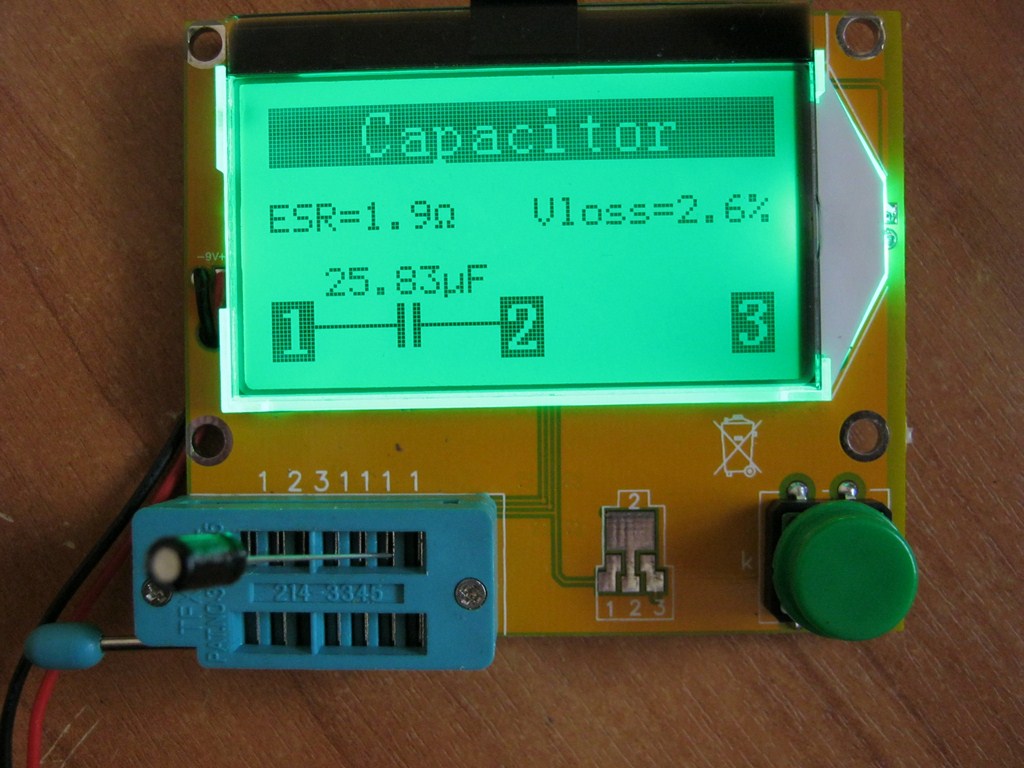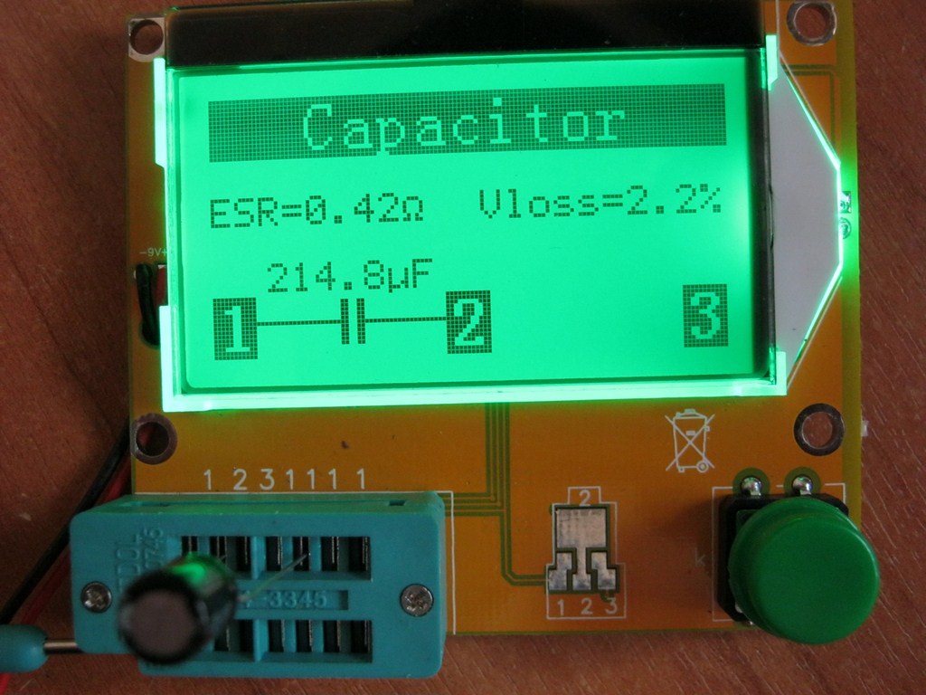 Давайте замеряем некоторые наши китайские конденсаторы на ESR. Для этого берем наш многофункциональный универсальный R/L/C/Transistor-metr и проведем несколько замеров: