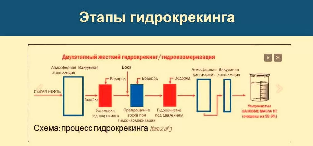 Что такое в принципе «химический синтез» или даже просто «синтез»? Это процесс создания чего-то нового, сложного из отдельных более простых элементов. В процессе гидрокрекинга всё происходит не так, как при синтезе. Нефть на первоначальном этапе проходит такую же переработку, как и в случае с производством обычных минеральных масел. Затем обычные минеральные масла проходят дополнительную обработку для повышения индекса вязкости и очистки от нежелательных примесей. Эта обработка происходит в условии высокого давления, температуры и катализаторов. В итоге мы получаем улучшенное путём гидрокрекинга минеральное масло.