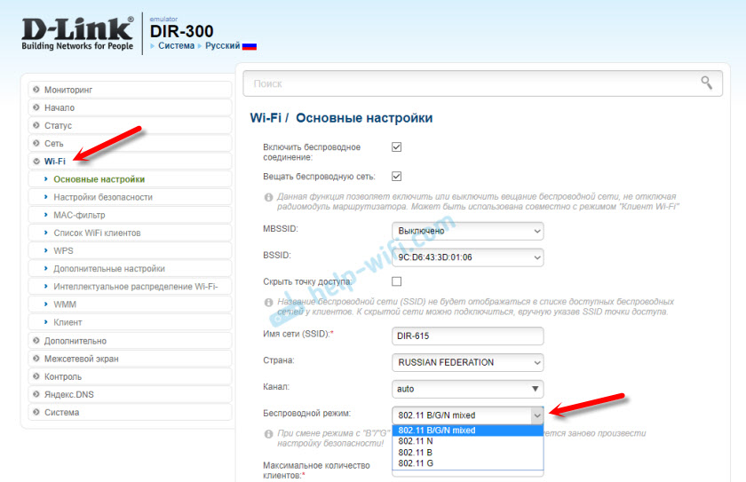 Так как у них есть много версий веб-интерфейса, то рассмотрим несколько из них. Если в вашем случае светлый веб-интерфейс как на скриншоте ниже, то откройте раздел «Wi-Fi». Там будет пункт «Беспроводной режим» с четырьмя вариантами: 802.11 B/G/N mixed, и отдельно N/B/G.