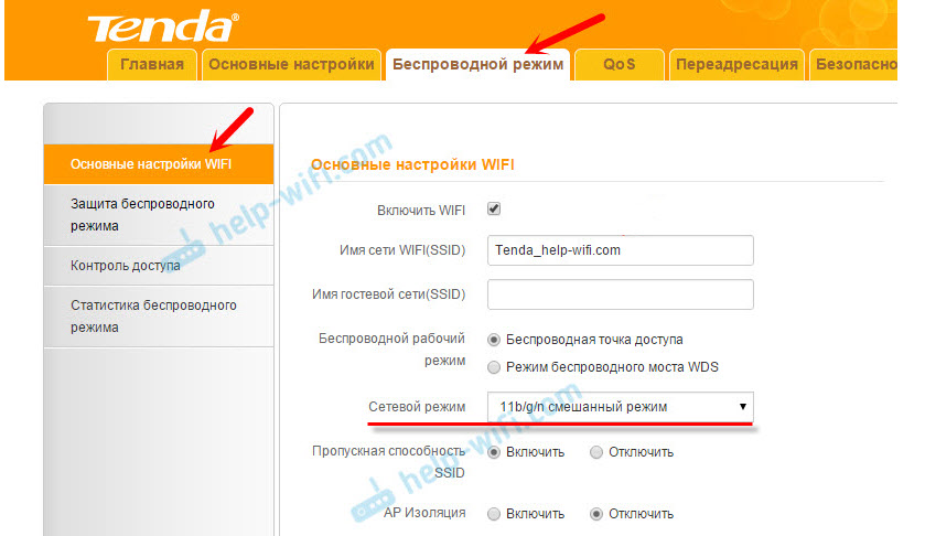 Настройка сетевого режима Wi-Fi на роутере Tenda