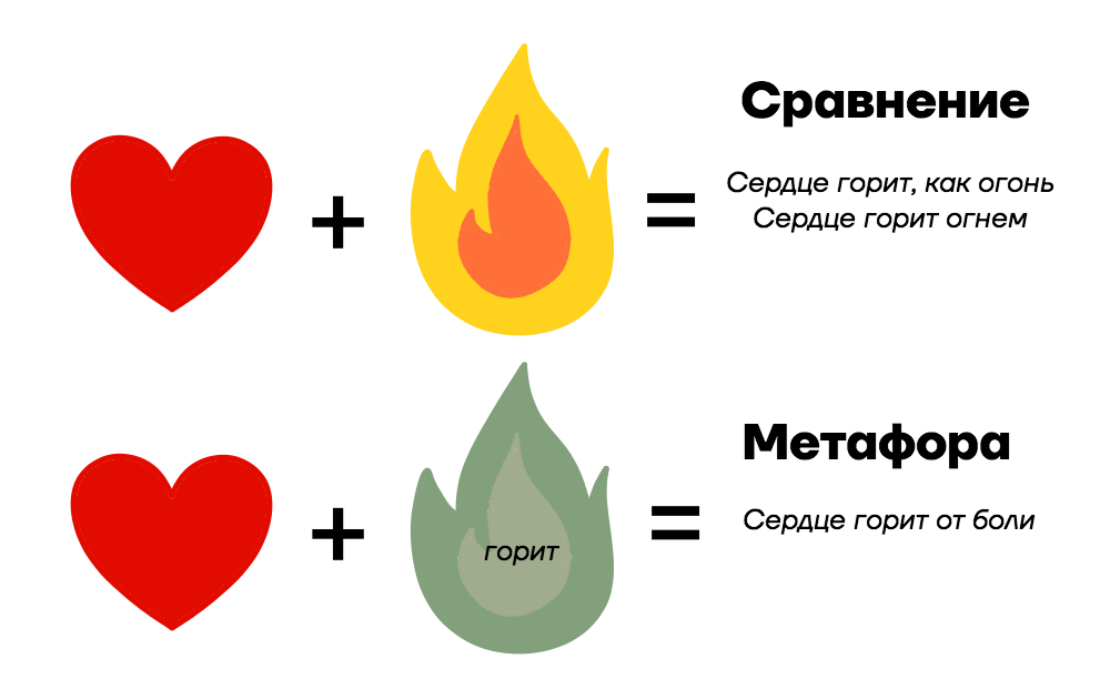 | Как отличить средства выразительности, которые старательно притворяются друг другом?Посмотрим на примеры:«Сердце горячее, как огонь» (сравнение) и «Сердце горит от боли» (метафора).В обоих случаях мы сравниваем сердце с огнем.В первом говорим открыто: у нас есть оба объекта — сердце и огонь, они названы четко.Во втором случае мы наделяем сердце свойством огня — говорим, что оно горит, и скрыто сравниваем сердце с огнем. Мы не называем второй объект (огонь), а только намекаем на него (словом «горит»). |