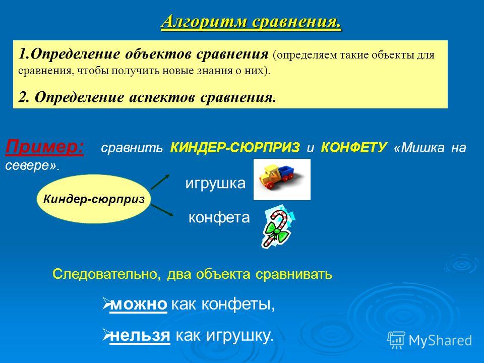Алгоритм сравнения. 1.Определение объектов сравнения (определяем такие объекты для сравнения, чтобы получить новые знания о них). 2. Определение аспектов сравнения. Пример: сравнить КИНДЕР-СЮРПРИЗ и КОНФЕТУ «Мишка на севере». игрушка конфета Киндер-сюрприз Следовательно, два объекта сравнивать можно как конфеты, нельзя как игрушку.