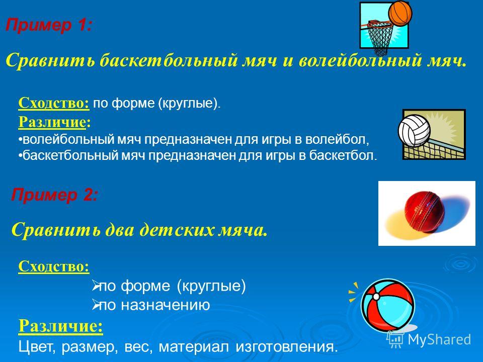 Пример 1: Сравнить баскетбольный мяч и волейбольный мяч. Сходство: по форме (круглые). Различие: волейбольный мяч предназначен для игры в волейбол, баскетбольный мяч предназначен для игры в баскетбол. Пример 2: Сравнить два детских мяча. Сходство: по форме (круглые) по назначению Различие: Цвет, размер, вес, материал изготовления.