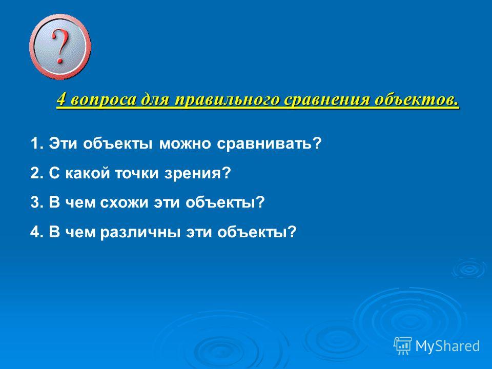 4 вопроса для правильного сравнения объектов. 1.Эти объекты можно сравнивать? 2.С какой точки зрения? 3.В чем схожи эти объекты? 4.В чем различны эти объекты?