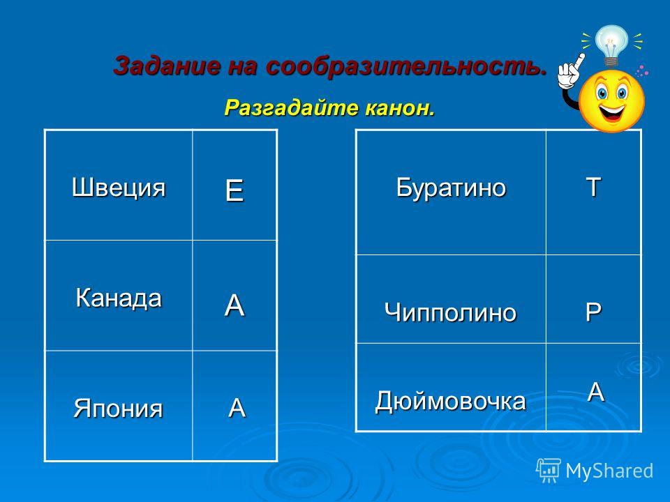Задание на сообразительность. Разгадайте канон. ШвецияЕ КанадаА ЯпонияБуратиноТЧипполиноР Дюймовочка А А