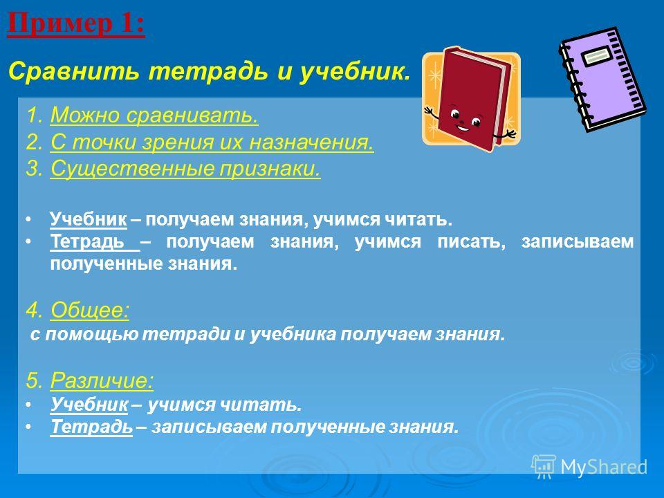 Пример 1: Сравнить тетрадь и учебник. 1.Можно сравнивать. 2.С точки зрения их назначения. 3.Существенные признаки. Учебник – получаем знания, учимся читать. Тетрадь – получаем знания, учимся писать, записываем полученные знания. 4.Общее: с помощью тетради и учебника получаем знания. 5.Различие: Учебник – учимся читать. Тетрадь – записываем полученные знания.