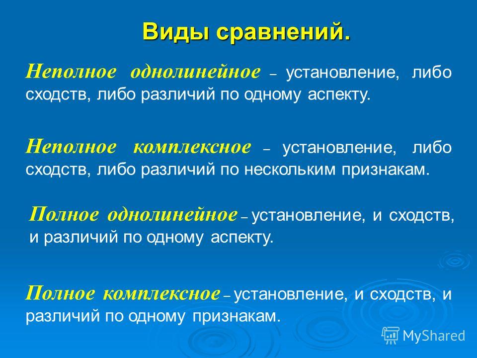 Виды сравнений. Неполное однолинейное – установление, либо сходств, либо различий по одному аспекту. Неполное комплексное – установление, либо сходств, либо различий по нескольким признакам. Полное комплексное – установление, и сходств, и различий по одному признакам. Полное однолинейное – установление, и сходств, и различий по одному аспекту.